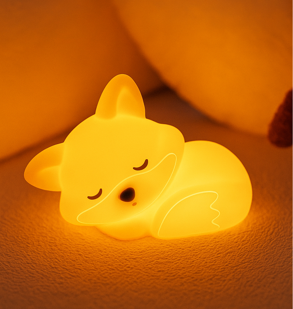 DreamFox™ es una lámpara de silicona con forma de zorro, suave, recargable y con luz cálida regulable.Ideal para decorar, relajarte o acompañar tus noches con ternura.